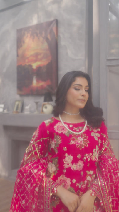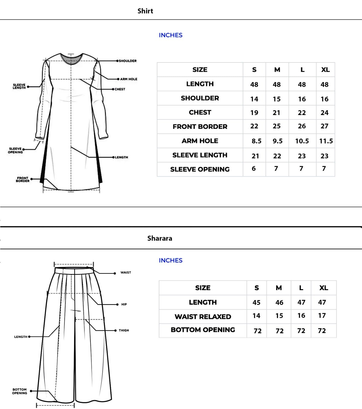 Flared sharara featuring fine embroidery and hand embellishments for a regal silhouette.